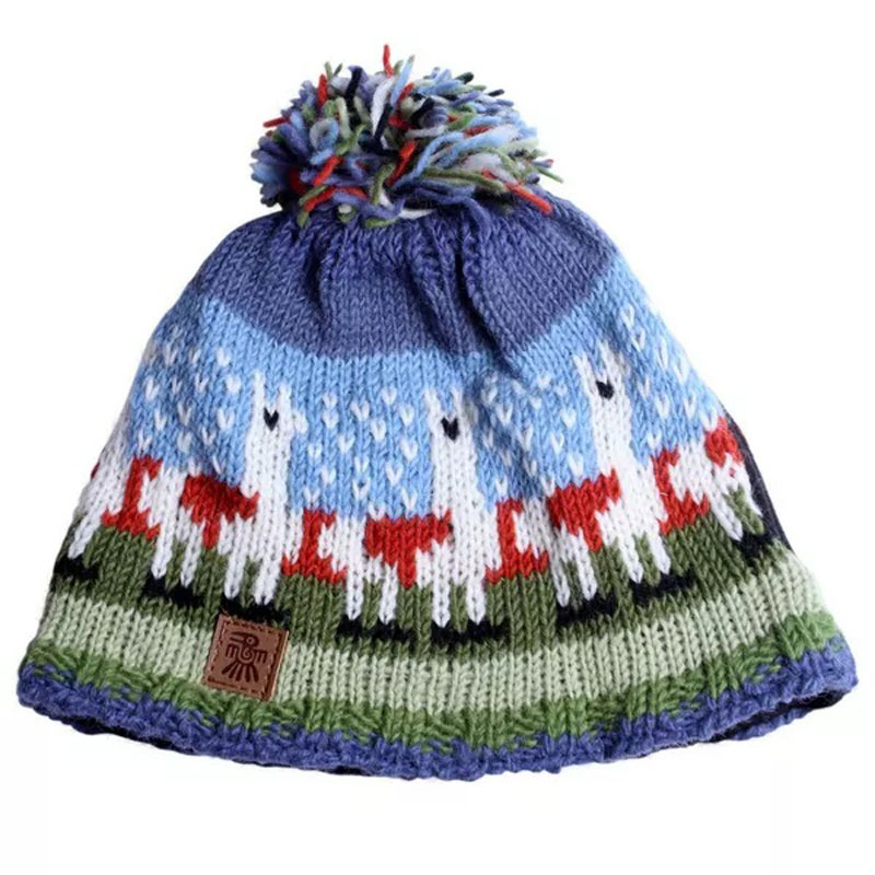 It features a row of Llamas on a blue & green knitted background finished with a matching bobble.