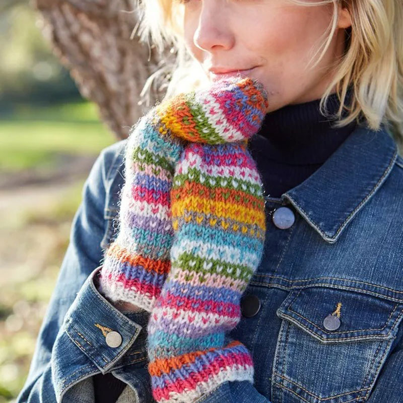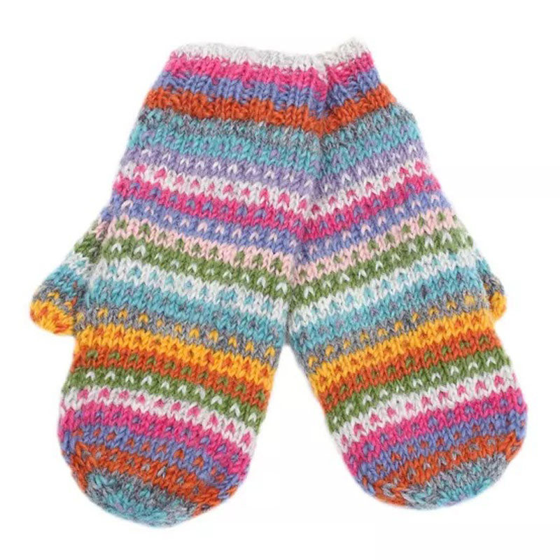 These hand-knitted lined mittens are made from 100% wool with a fleece lining, the design features brightly coloured dotty stripes. They are knitted in Nepal by local villagers using local wools and natural dyes to Pachamama designs.