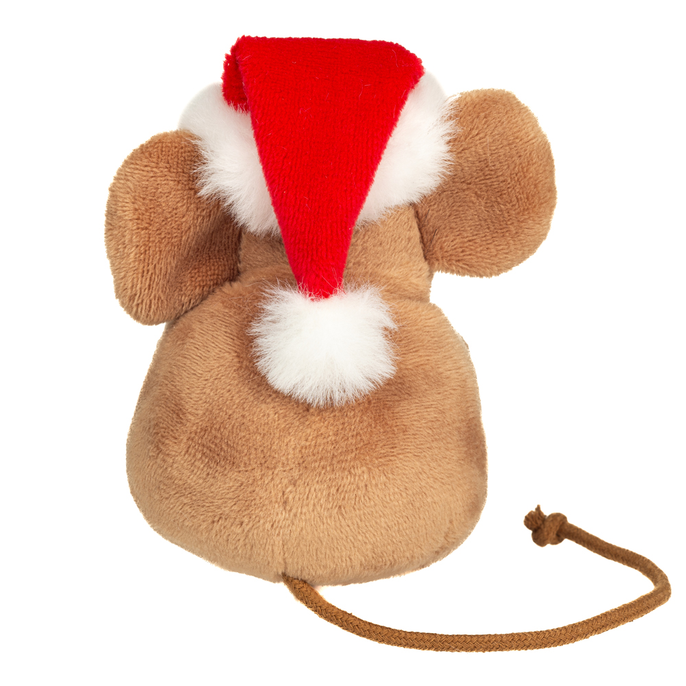 Coming with a beige-brown fur body, white tummy, pink inner ears, long tail, whiskers, wearing a Christmas red santa hat and holding a little green Christmas tree.