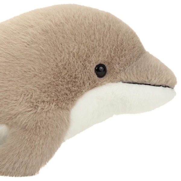 Coming in a silky soft beige fur body with a white underside, the classic dolphin tail, fins and snout, black safety eyes and a smiley face.
