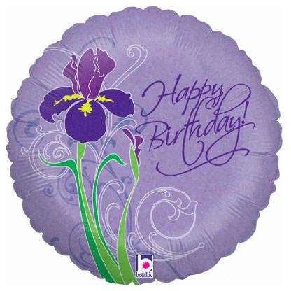 Coming with a mauve coloured base, a picture of a purple Iris flower and the words 'Happy Birthday' in puple, supplied with a non metallic ribbon tie and a weight to stop it from floating away.