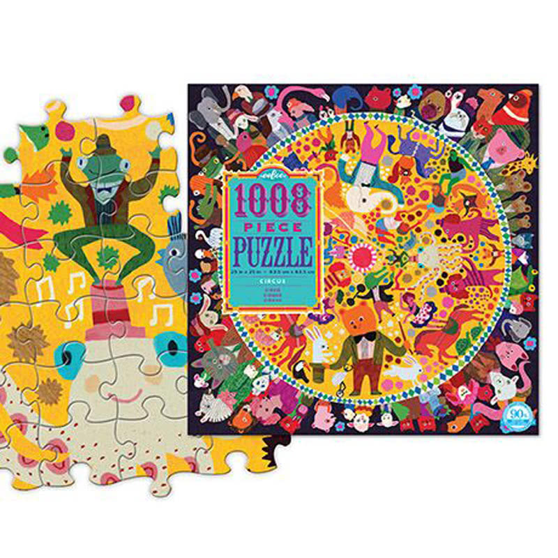 Introducing the Circus 1000 Piece Puzzle by Eeboo. Another delightful eeboo jigsaw puzzle illustrated by Monika Forsberg. With no top or bottom, this family style puzzle is perfect for a group to work on around the table. In this circus, an animal audience watches a wonderfully whimsical performance. Can you find the horseback riding squirrel or weight-lifting alligator? For a closer look at Eeboo's Circus 1000 Piece Puzzle simply roll the mouse over the image.