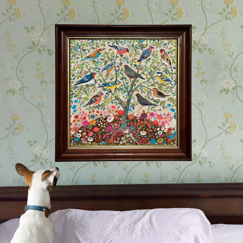 With their highly detailed, radiantly coloured plumage, there are twelve varieties of English Songbirds, perched on a tree amidst the beauty of an English garden.