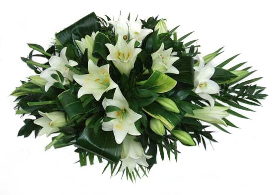 This is the very popular White Lily Elongated Funeral Flower Spray made with Best white Lilies plus Ruscus, Aspidistra and Palm Leaf.