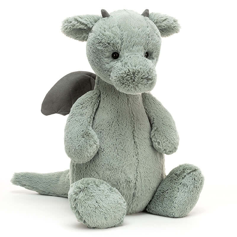 Introducing Bashful Dragon by Jellycat. Coming with super-soft fur in pale sage green, suedey horns and a long, squidgy tail, cute little dragon wings and super cute looks, a dragon fans dream! If you would like a closer look at Jellycat's Bashful Dragon simply roll the mouse over the image. Do not tumble dry, dry clean or iron. Check all labels upon arrival.