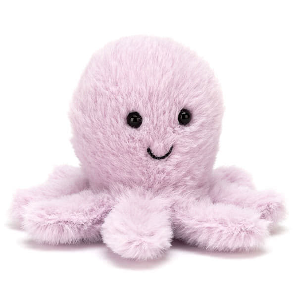 Jellycat Fluffy Octopus. This fluffy lavender octopus is bright-eyed and smiley faced, with cute chunky arms. Real Octopuses have three hearts and blue blood, they are boneless and squirt ink to deter predators but don't worry your pocket sized little beauty is just super soft and ink free! If you would like a closer look at Jellycat's Fluffy Octopus simply roll the mouse over the image. Do not tumble dry, dry clean or iron. Check all labels.