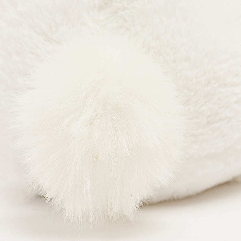 Available in two sizes, huge and medium. This gorgeous bunny comes with snow white fluffy fur, and beautiful features. They are well stuffed and have extra fluffy white bobtails. The nose glistens with contrasting sparkling threads.
