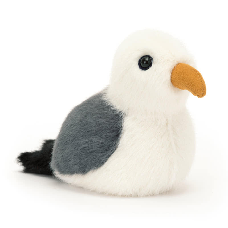 Introducing the Jellycat Birdling Seagull. Every day is a seaside day with Birdling Seagull. Squishy and soft in shades of cream and grey fur with a suedey orange beak, this is one seagull you don’t have to worry about stealing your chips! For a closer look at Jellycat's Birdling Seagull simply roll the mouse over the image. Do not tumble dry, dry clean or iron. Check all labels.