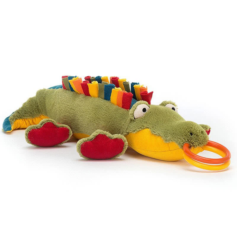 Introducing our Jellycat Happihoop Croc. This colourful crocodile has a sage green, super soft fur body, a cordy bright yellow tummy plus boggly eyes, scarlet feet and a turquoise back, but that's not all. He also has oodles of funky features for tots to discover including teething rings, tufty chewy spines, crinkles, rattles and squeakers galore! For a closer look at Jellycat's Happihoop Croc simply roll the mouse over the image. Do not tumble dry or dry clean.