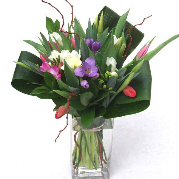This stunning Mothers Day Tulip and Freesia Arrangement consists of assorted Tulips and Freesia plus Aspidistra and Twisted Willow supplied in a rectangular glass vase, a super popular choice for Mothers Day. If you would like to take a closer look at this gorgeous Spring like Flower display simply roll the mouse over the image.