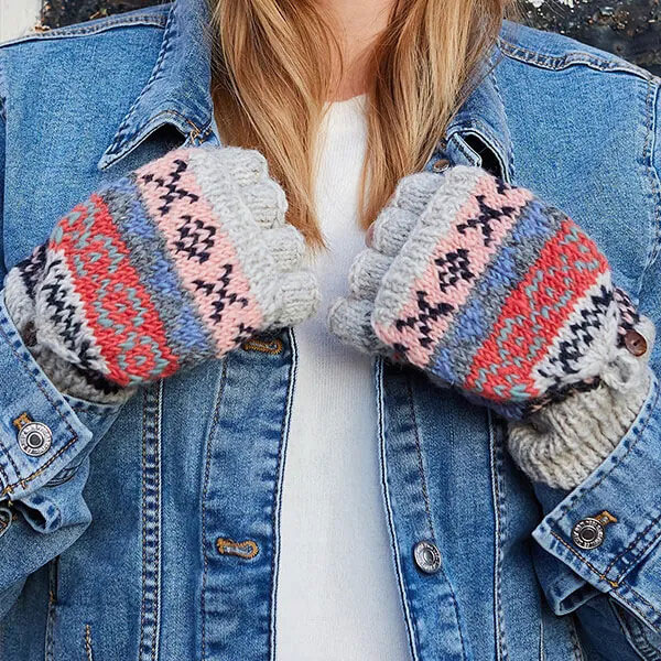 These glove mittens are knitted in Nepal by local villagers using local wools and natural dyes. Close the flap to keep your fingers warm. Fasten back the flap with the coconut button to use your fingers.