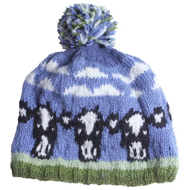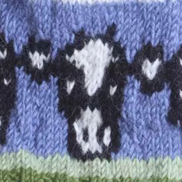 It features Friesian cows and scudding clouds on a blue and green knitted background.