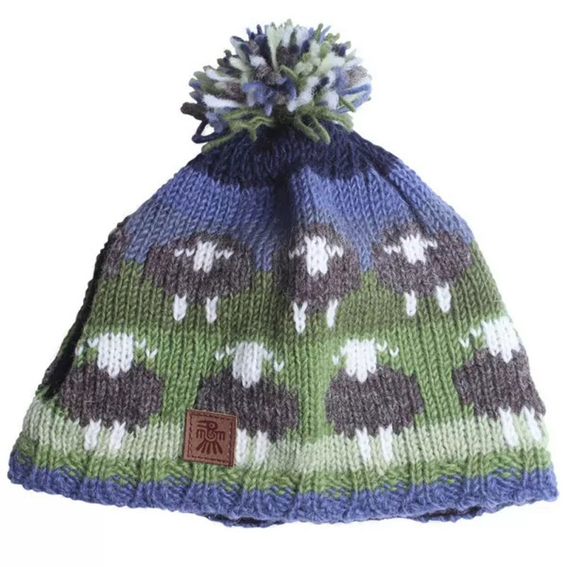 It features rows of black sheep on a blue & green knitted background finished with a matching bobble.