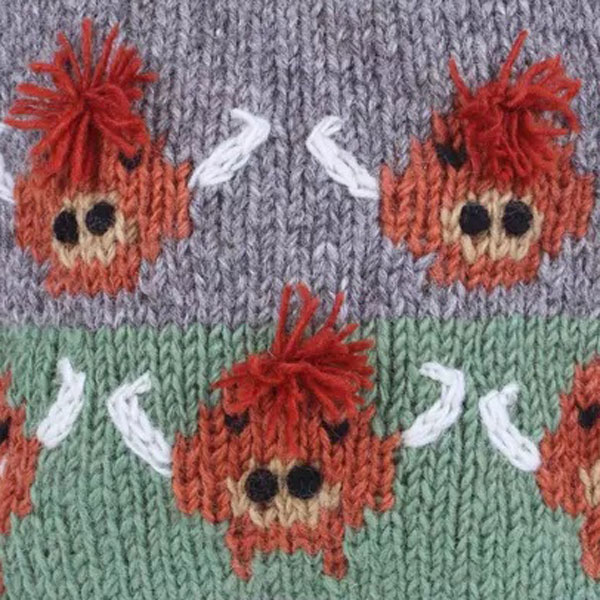 Made with 100% wool and natural dyes, it features hand embroidered highland cows on a grey and green hand-knitted back-ground.