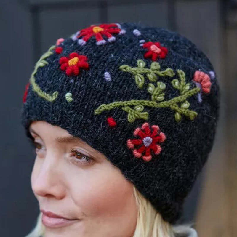 These hand knitted Beanies are made from 100% wool with a partial Sherpa fleece lining along the inside edge. This elegant range features vibrant hand embroidered flowers, keep warm in style with the Charcoal Lugano Beanie.