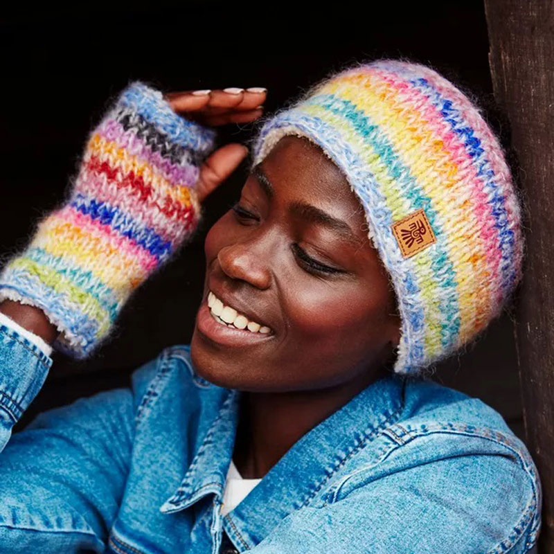 Hand knitted in Nepal by local villagers using blended wools, mohair, nylon and natural dyes. Inspired by the vibrant city of San Francisco, this rainbow design will brighten up any dull, wintery day.