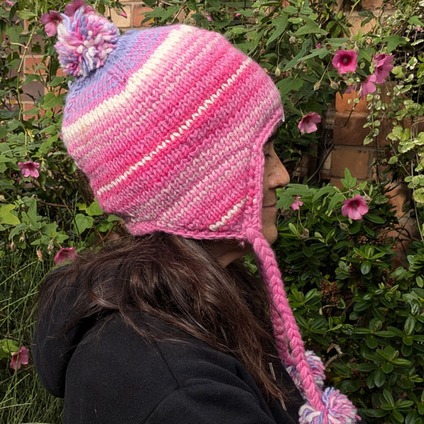 These hand knitted chullo hats are made from 100% wool with a fleece lining. They come with ear flaps & pink braids finished with fluffy bobbles.