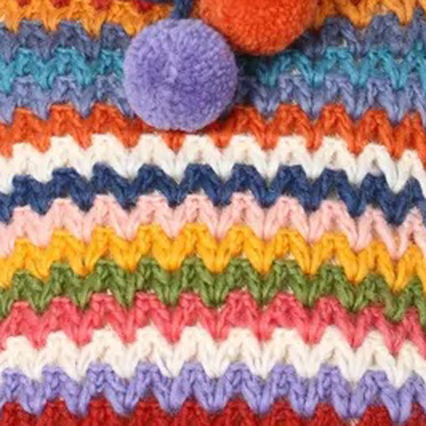 Yucatan is a colourful rainbow zigzag pattern finished with two bobble pompoms.