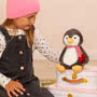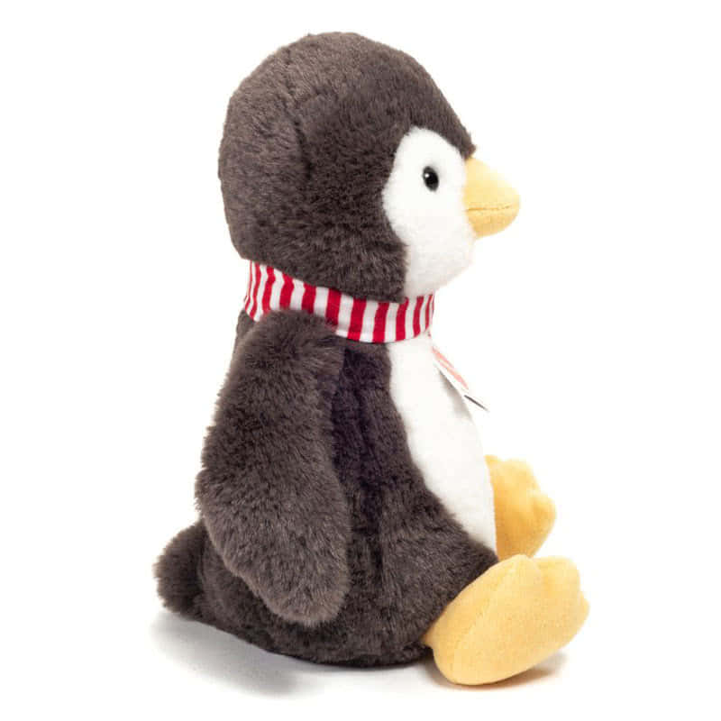Coming in a super soft dark grey fur body with a white bib tummy, matching face and yellow feet and beak. The whole image is finished with a neat red and white tasselled scarf. If you are into cute this is definitely going on your wish list!